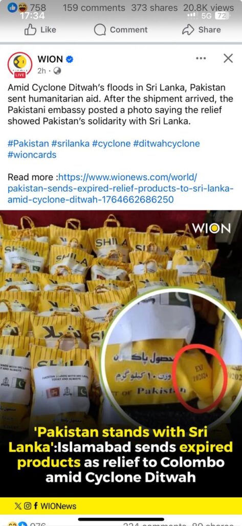 The controversy was ignited when the Indian news channel WION aired a report accusing Pakistan of delivering “expired” humanitarian aid to Sri Lanka. The report highlighted an expiration date marked “EXP 10/2024” printed on one of the aid bags.