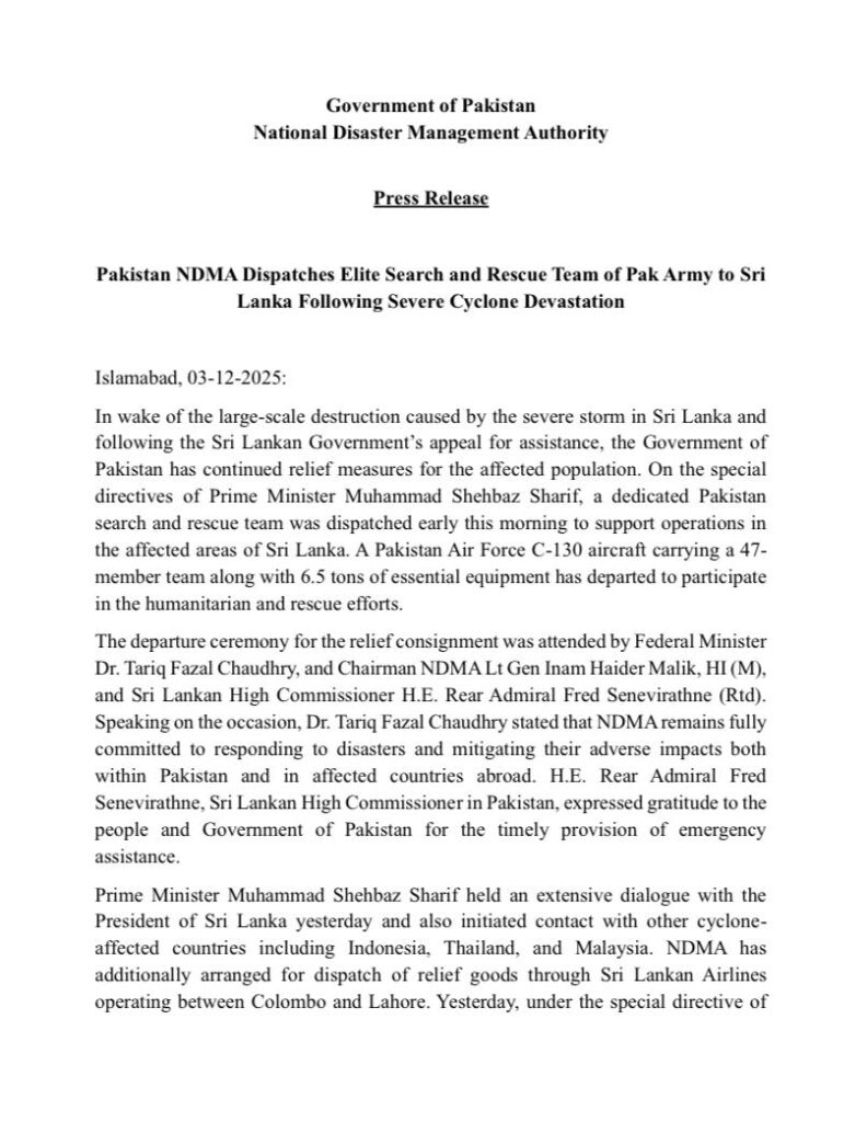 Despite the political noise, the Government of Pakistan proceeded with a comprehensive relief program managed through its National Disaster Management Authority (NDMA), as detailed in its December 3rd Press Release. Key actions included: