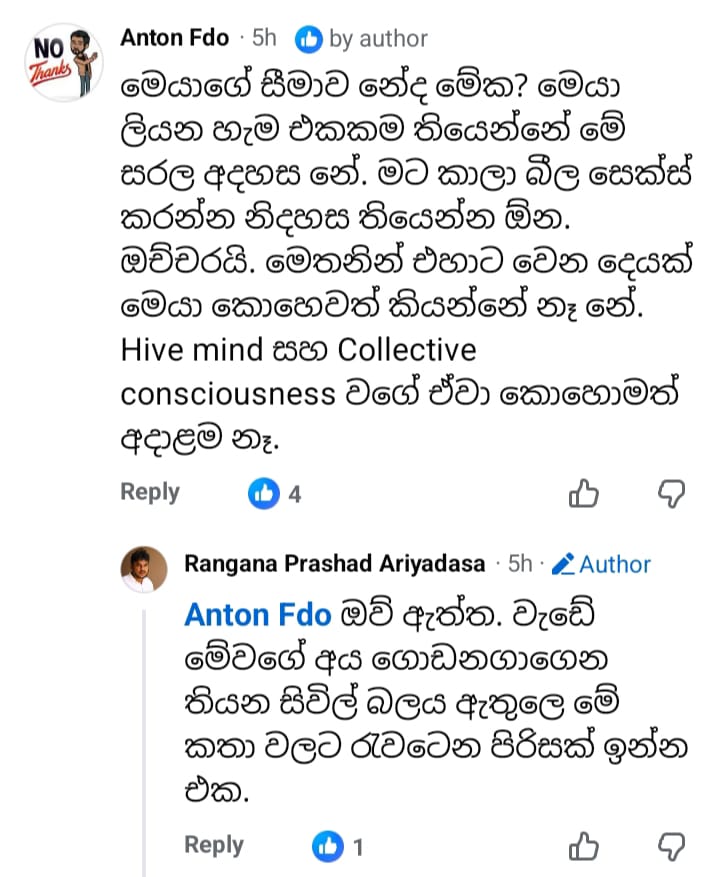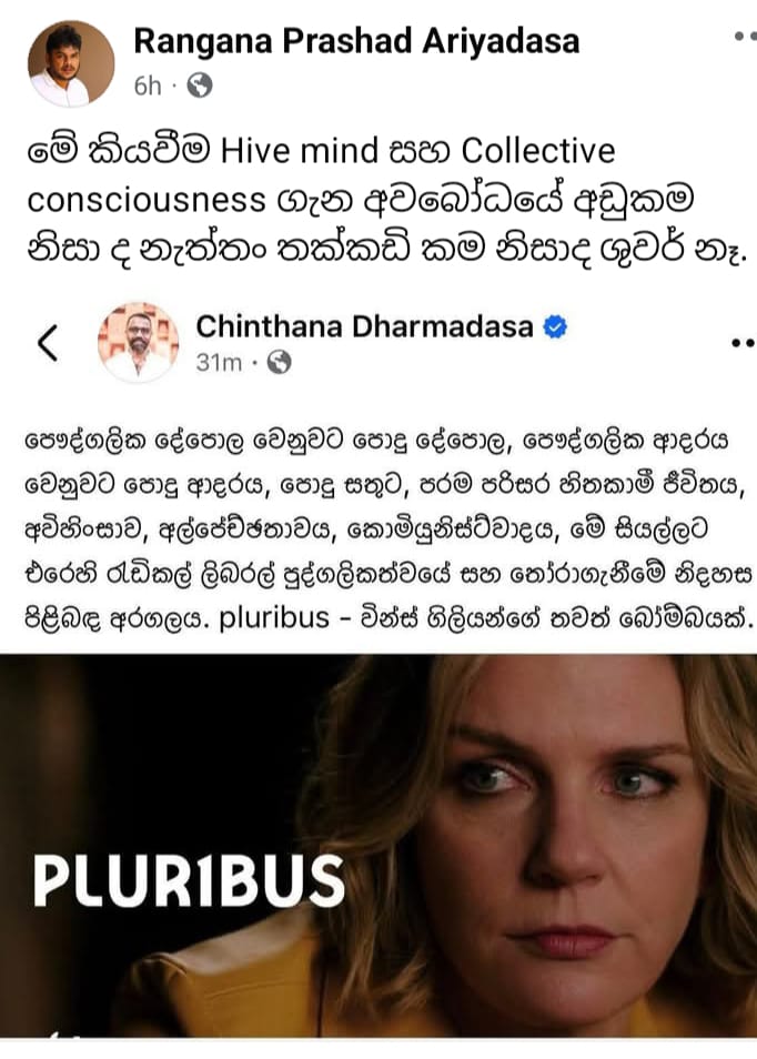 “මේ කියවීම Hive mind සහ Collective consciousness ගැන අවබෝධයේ අඩුකම නිසා ද නැත්තං තක්කඩි කම නිසාද ශුවර් නෑ.” – රංගන ප්රසාද් ආරියදාස