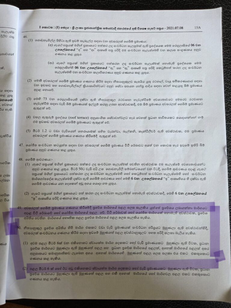 රජයේ ගැසට් නිවේදන රෙගුලාසිවලට අනුව, ගොඩනැගිල්ලක උස ගණනය කළ හැක්කේ ප්රවේශ මාර්ග දෙකම එකම කලාපකරණ කාණ්ඩයක් තුළ පිහිටා තිබේ නම් පමණි. මෙම ව්යාපෘතියේ එක් ප්රවේශයක් මිශ්ර සංවර්ධන කලාපයකද, අනෙක විශේෂ නේවාසික කලාපයකද පිහිටා තිබීම හේතුවෙන්, ලබා දී ඇති අනුමැතිය මුළුමණින්ම නීති විරෝධී වේ.