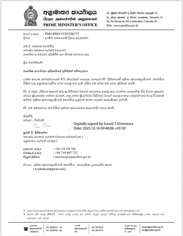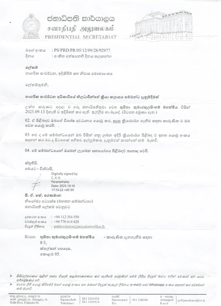 ජනාධිපති ලේකම් කාර්යාලය (10.10.2025) සහ අග්රාමාත්ය කාර්යාලය (14.10.2025) විසින් පැමිණිල්ල ලැබුණු බව තහවුරු කර ඇති අතර, අක්රමිකතා අනාවරණය වුවහොත් නීතිමය ක්රියාමාර්ග ගැනීමට අදාළ බලධාරීන්ට උපදෙස් දී ඇති බව වාර්තා වේ.