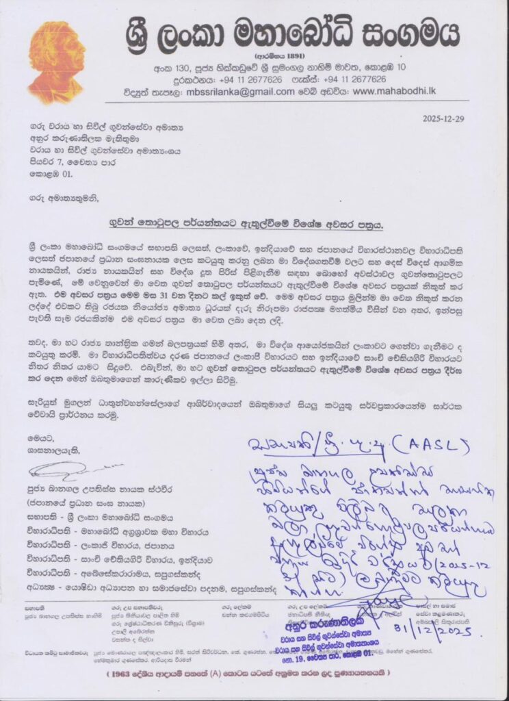 අදාළ ලිපියට අමාත්යවරයා විසින් අත් අකුරින් සටහනක් යොදමින්, ගුවන්තොටුපළ බලධාරීන් වෙත දන්වා ඇත්තේ උන්වහන්සේගේ ඉල්ලීම සලකා බලා කටයුතු කරන ලෙසයි.
