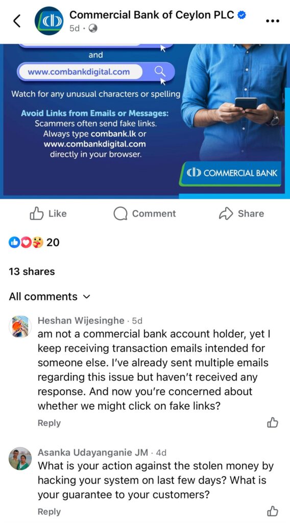 The Criminal Investigation Department (CID) has launched a comprehensive investigation into a massive cyber heist involving Commercial Bank, one of Sri Lanka’s premier private banks, where tens of millions of rupees were stolen from customers through a sophisticated fake website.