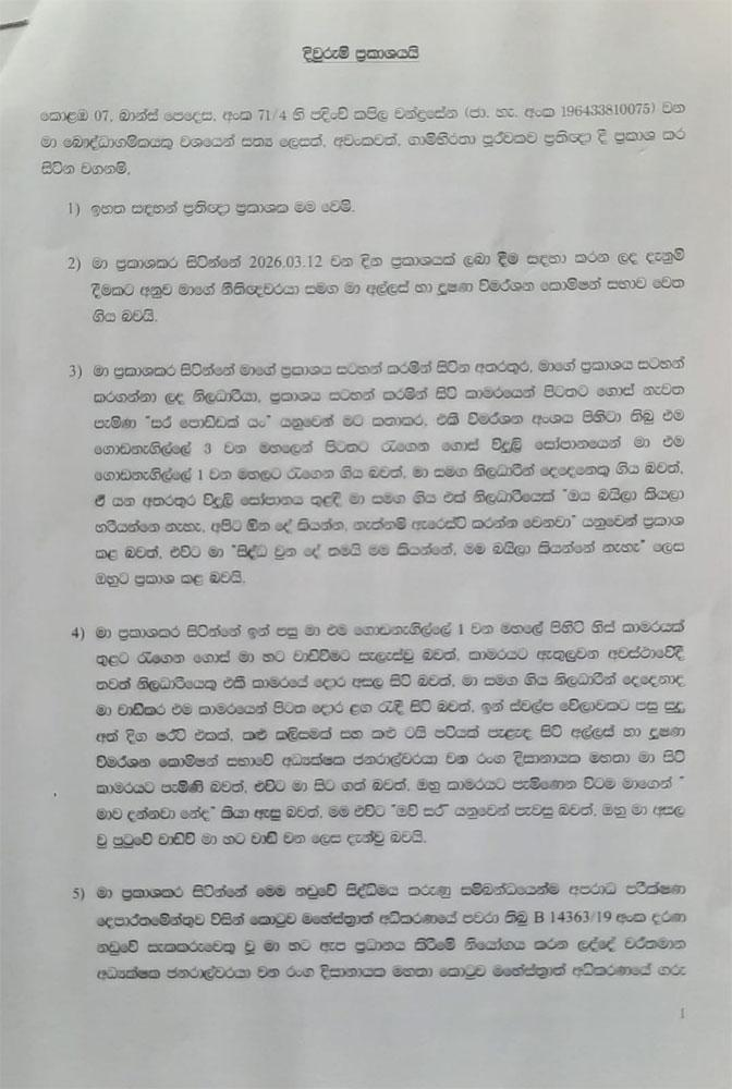 එහෙත්, එම ප්රකාශය තමන් ස්වේච්ඡාවෙන් ලබා දුන්නක් නොවන බව කපිල චන්ද්රසේන මහතා දැන් අවධාරණය කරයි. ඔහු පවසන්නේ 2026.03.12 වන දින ප්රකාශය ලබා දීමට ගිය අවස්ථාවේදී කොමිසමේ නිලධාරීන් තමන්ව ප්රකාශ සටහන් කරගන්නා කාමරයෙන් ඉවතට රැගෙන ගොස් මෙම තර්ජනය කිරීම් සිදු කළ බවයි.