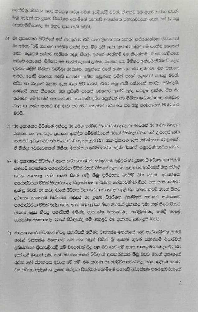 ඔහුගේ නීතිඥවරයා හරහා මාර්තු 18 වන දින කොළඹ රිමාන්ඩ් බන්ධනාගාරයේදී අත්සන් කර නිකුත් කර ඇති මෙම දිවුරුම් ප්රකාශය මගින් චෝදනා කරන්නේ, හිටපු ජනාධිපති මහින්ද රාජපක්ෂ මහතාගේ සහ පාර්ලිමේන්තු මන්ත්රී නාමල් රාජපක්ෂ මහතාගේ නම් අදාළ ප්රකාශයට ඇතුළත් කරන ලෙස කොමිසමේ අධ්යක්ෂක ජනරාල්වරයා ඇතුළු නිලධාරීන් තමන්ට තර්ජනය කළ බවයි.