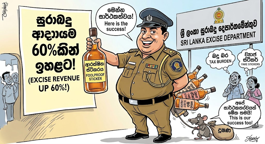 ශ්‍රී ලංකා සුරාබදු දෙපාර්තමේන්තුවේ ආදායම පසුගිය වසර තුන තුළදී සියයට 60 කට අධික ප්‍රතිශතයකින් වර්ධනය වී ඇති බව සුරාබදු දෙපාර්තමේන්තුව උදම් අනයි. මත්පැන් බෝතල්වල ආරක්ෂිත ස්ටිකර් (Foolproof Stickers) ඇළවීම හරහා බදු ආදායම ප්‍රශස්ත ලෙස රැස් කරගැනීමට හැකිවීම මෙම වර්ධනයට ප්‍රධාන හේතුව බව ඔවුන්ගේ නිල නිවේදනවල දැක්වේ.