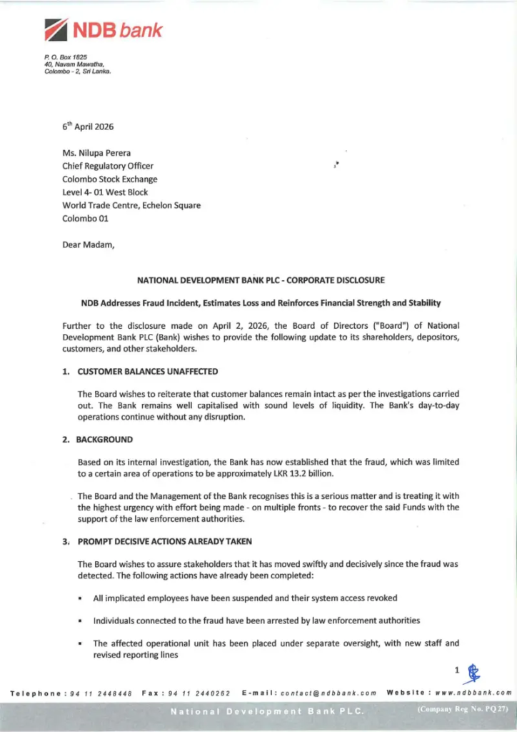 මේ අතර, NDB බැංකුව 2026 අප්රේල් 6 වැනිදා කොළඹ කොටස් වෙළෙඳපොළ වෙත නිකුත් කර ඇති ලිපියකට අනුව බැංකුව විසින් සිදු කරන ලද අභ්යන්තර විමර්ශනයකින් ආසන්න වශයෙන් රුපියල් බිලියන 13.2ක වංචාවක් සිදුව ඇති බව දන්වා තිබේ.