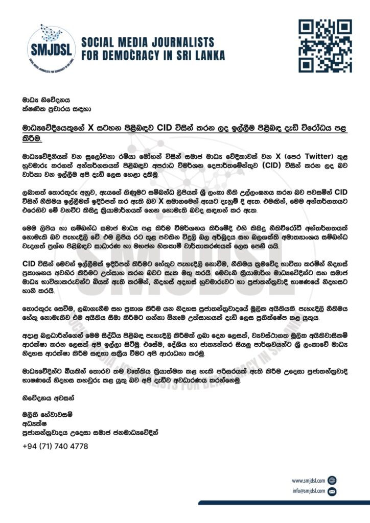 නිදහස් මත ප්රකාශනයට සහ වෘත්තීය මාධ්යවේදීන්ගේ කටයුතුවලට බාධා පමුණුවන මෙම ක්රියාකලාපය හෙළා දකිමින් ‘ශ්රී ලංකාවේ ප්රජාතන්ත්රවාදය සඳහා සමාජ මාධ්ය මාධ්යවේදීන්ගේ එකතුව’ නිකුත් කළ නිවේදනය පහත දැක්වේ.