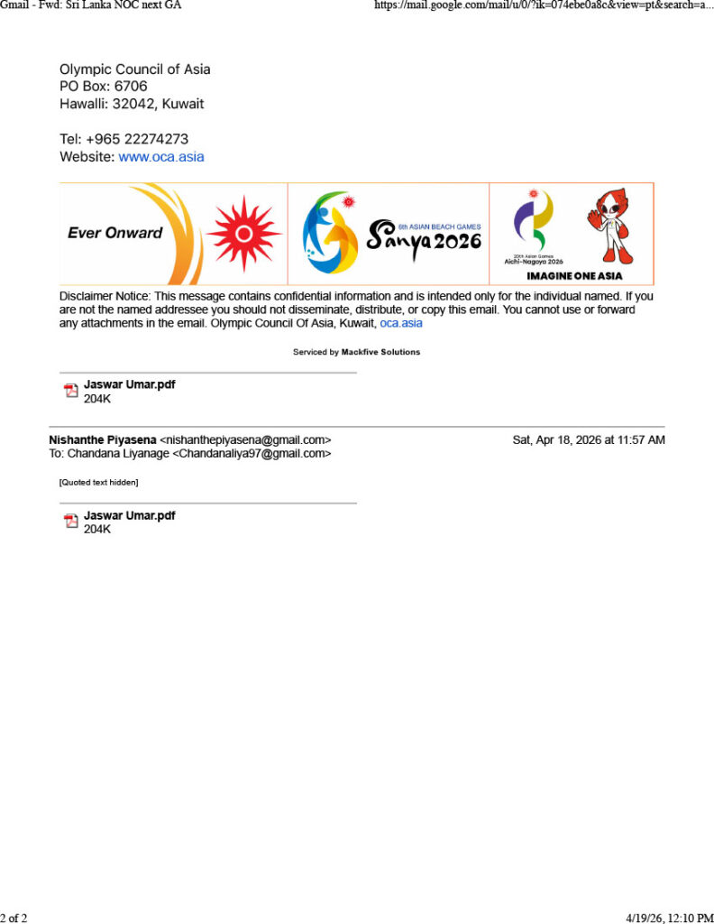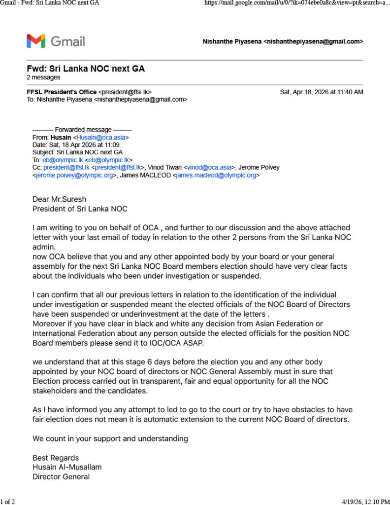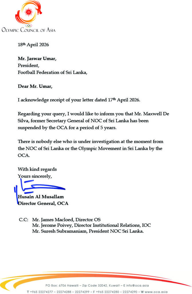 Parallel to the committee’s decision, the Olympic Council of Asia (OCA) has issued a stern warning to the outgoing NOCSL administration. In a formal communication dated April 18, OCA Director General Husain Al-Musallam clarified that: