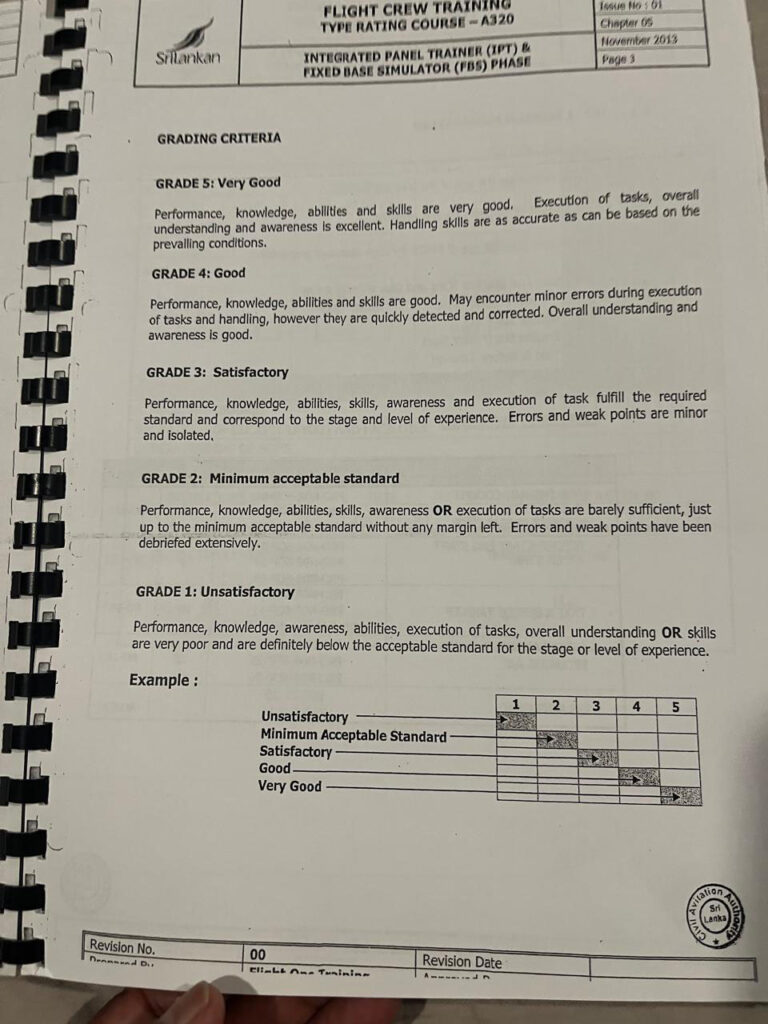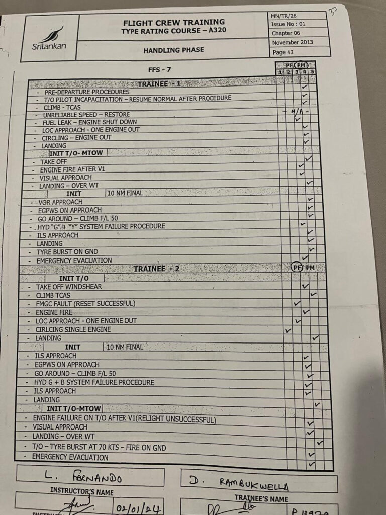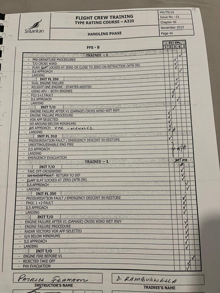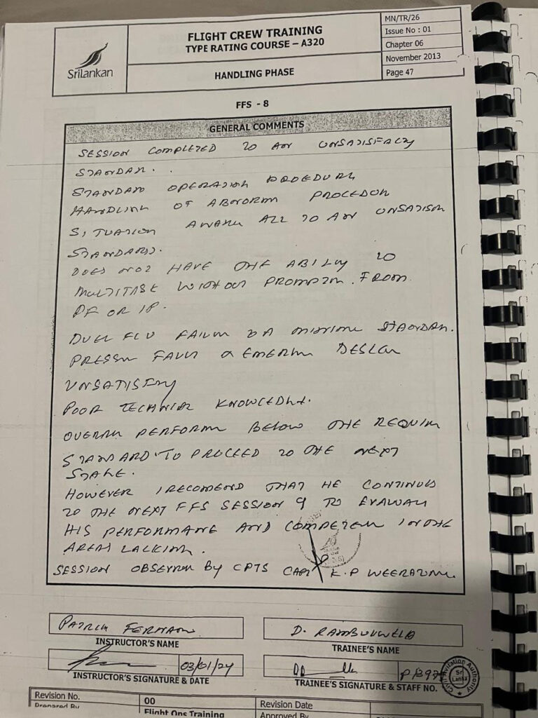2024 පෙබරවාරි 24 දිනැති හිටපු ශ්රී ලන්කන් ප්රමිති කමිටුවේ ගුවන් නියමුවන් විසින් සමාගමේ CEO වෙත යවන ලද විද්යුත් තැපෑලකින් පැහැදිලි වන්නේ, රඹුක්වැල්ල මහතා පුහුණුවේදී “1” ශ්රේණියක් (Unsatisfactory/Fail) ලබාගෙන ඇති බවයි. FOM, Part D 9.6.5.f) අනුව, එවැනි අසමත් වීමක් යනු පුහුණුව අත්හිටුවීමට හේතුවක් වුවද, එවකට ගුවන් මෙහෙයුම් ප්රධානී වූ කැප්ටන් පැට්රික් ප්රනාන්දුගේ මැදිහත්වීම මත පුහුණුව ඉදිරියට ගෙන ගොස් ඇති බවට චෝදනා එල්ල වේ. මෙම තීරණය සමාගම් පුහුණු ප්රතිපත්තියේ බරපතල උල්ලංඝනයක් බවට උපදේශක කමිටුව චෝදනා කරයි.