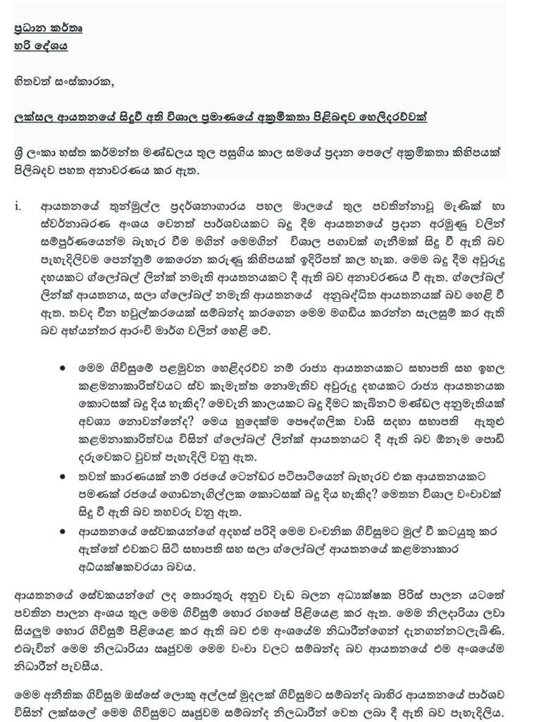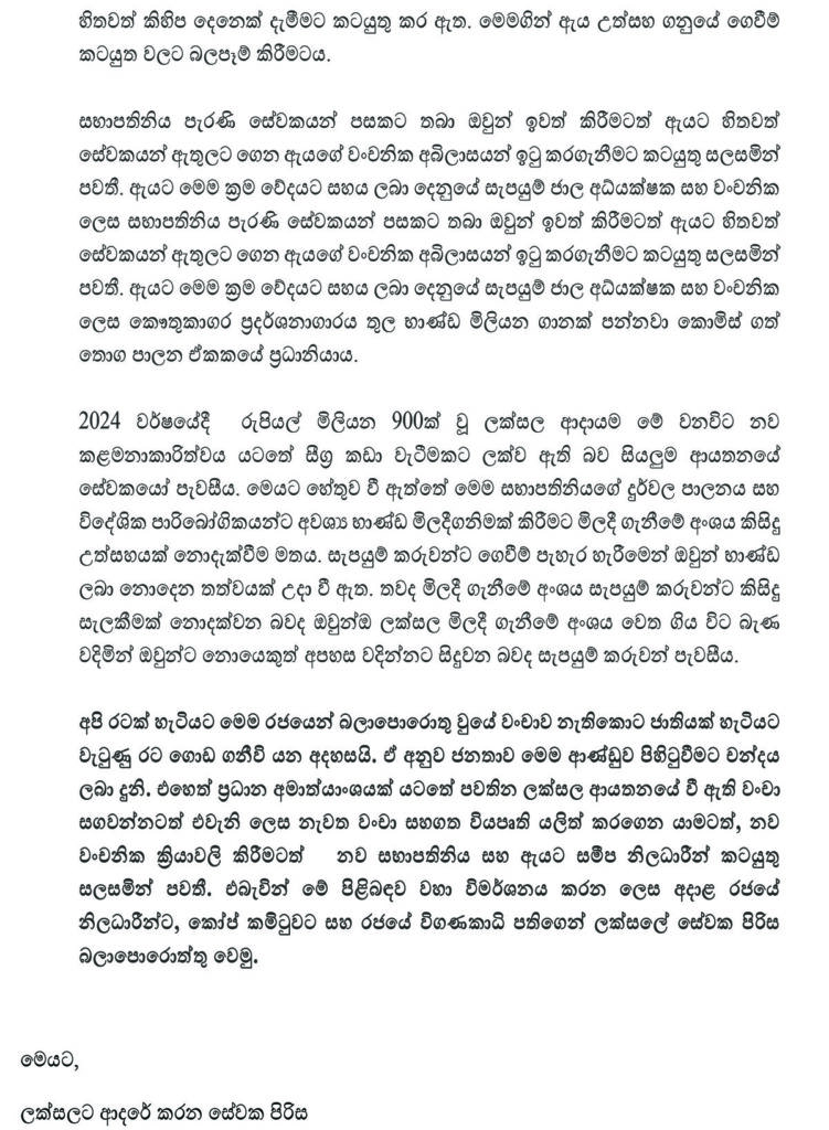 අපි රටක් හැටියට මෙම රජයෙන් බලාපොරොතු වුයේ වංචාව නැතිකොට ජාතියක් හැටියට වැටුණු රට ගොඩ ගනිවී යන අදහසයි. ඒ අනුව ජනතාව මෙම ආණ්ඩුව පිහිටුවීමට චන්දය ලබා දුනි. එහෙත් ප්රධාන අමාත් යාංශයක් යටතේ පවතින ලක්සල ආයතනයේ වී ඇති වංචා සගවන්නටත් එවැනි ලෙස නැවත වංචා සහගත වියපෘති යලින් කරගෙන යාමටත්, නව වංචනික ක්රියාවලි කිරීමටත් නව සභාපතිනිය සහ ඇයට සමීප නිලධාරීන් කටයුතු සලසමින් පවතී. එබැවින් මේ පිළිබඳව වහා විමර්ශනය කරන ලෙස අදාළ රජයේ නිලධාරීන්ට, කෝප් කමිටුවට සහ රජයේ විගණකාධි පතිගෙන් ලක්සලේ සේවක පිරිස බලාපොරොත්තු වෙමු.
