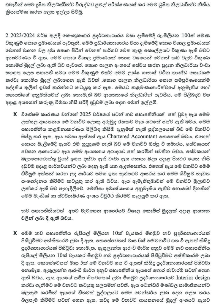 2 2023/2024 වර්ෂ තුලදී කෞතුකාගාර ප්රදර්ශනාගාරය වසා දැමීමේදී රු.මිලියන 100ක් පමණ විකුණුම් තොග ප්රමාණයක් පැවතුනි. මෙම ප්රධාර්ශනාගාරය වසා දැමීමේදී තොග විශාල ප්රමාණයක් වෙනත් වාහන වල දමා තොග පිටින් වෙනත් පාර්ශව වෙත කුණු කොල්ලයට විකුණා ඇති බවට අනාවරණය වී ඇත. මෙම තොග විශාල ප්රමාණයක් තොග වශයෙන් වෙනත් කඩ වලට විකුණා කොමිස් මුදල් ලබා ඇති බව පැවසේ. තොග පාලන අංශයේ සේවය කරන ප්රදාන නිලධාරියා වංචා සහගත ලෙස සභාපති සමග මෙම විකුණුම් එක්ව මෙම ලක්ෂ ගානක් වටින භාණ්ඩ සොරකම් කරවා කොමිස මුදල් ලබාගෙන ඇති බවත් තොග පාලන නිලධාරියා තොග සම්පුර්ණයෙන්ම පද්දතිය තුලින් ඉවත් කරන්නට කටයුතු කර ඇත. මෙයට කළමණාකාරිත්වයේ අනුමැතිය හෝ සභාපතිගේ අනුමතියවත් ලබා නොමැති බව ආයතනයේ නිලධාරීන් පැවසීය. මේ පිලිබදව වහ අදාළ අයගෙන් කරුණු විමසා නිසි පරිදි දඩුවම් ලබා දෙන මෙන් ඉල්ලමි.