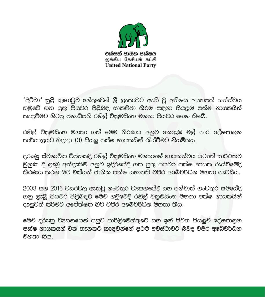 වත්මන් ආපදා තත්ත්වය පිළිබඳව සාකච්ඡාවක් සඳහා හිටපු ජනාධිපති රනිල් වික්රමසිංහ මහතා සියලු විපක්ෂ පක්ෂ කැඳවූ බව ඔහුගේ කාර්යාලය නිවේදනයක් නිකුත් කරමින් කියා සිටියි.