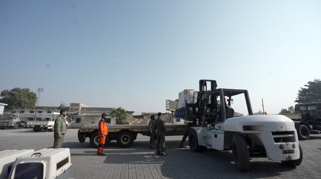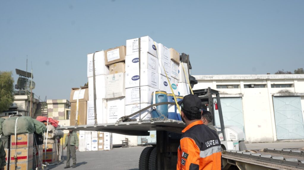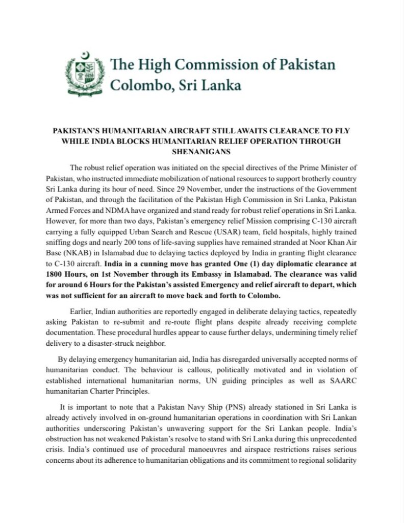 එම නිවේදනය දැඩි ලෙස අවධාරණය කරන්නේ, අගමැතිවරයාගේ විශේෂ උපදෙස් මත සූදානම් කළ සම්පූර්ණයෙන් සන්නද්ධ නාගරික සෙවීම් සහ ගලවා ගැනීමේ (USAR) කණ්ඩායම්, ක්ෂේත්ර රෝහල්, පුහුණු කළ සුනඛයන් සහ ටොන් 200කට ආසන්න ජීවිතාරක්ෂක ද්රව්ය රැගත් පකිස්ථාන හදිසි සහන මෙහෙයුම ඇතුළත් C-130 ගුවන් යානය, ගුවන් ගමන් අවසරය ප්රමාද කිරීමේ ඉන්දීය “උපායශීලී ක්රියා” (“shenanigans”) හේතුවෙන් දින දෙකකට වැඩි කාලයක් තිස්සේ ඉස්ලාමාබාද්හි නූර් ඛාන් ගුවන් කඳවුරේ (NKAB) සිර වී ඇති බවයි.