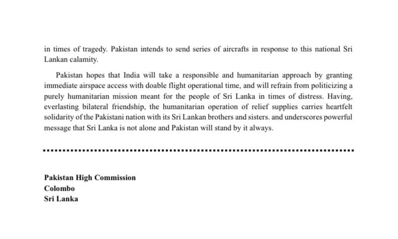 මේ ආකාරයට හදිසි මානුෂීය ආධාර ප්රමාද කිරීම, අර්බුදකාරී අවස්ථාවක කලාපීය සහයෝගීතාවයට ඇති ඉන්දියාවේ කැපවීම පිළිබඳව බරපතල සැකයන් මතු කරන බව පකිස්ථානය සඳහන් කරයි. කෙසේ වෙතත්, දැනටමත් ශ්රී ලංකාවේ ස්ථානගත කර ඇති පකිස්ථාන නාවික හමුදා නෞකාවක් (PNS) ශ්රී ලංකා බලධාරීන් සමඟ සම්බන්ධීකරණය කරමින් භූමියේ මානුෂීය මෙහෙයුම්වල නිරත වන බවත්, මෙම බාධාවෙන් ශ්රී ලංකාවට සහාය වීමට ඇති පකිස්ථානයේ අධිෂ්ඨානය දුර්වල නොවන බවත් තානාපති කාර්යාලය අවධාරණය කරයි.