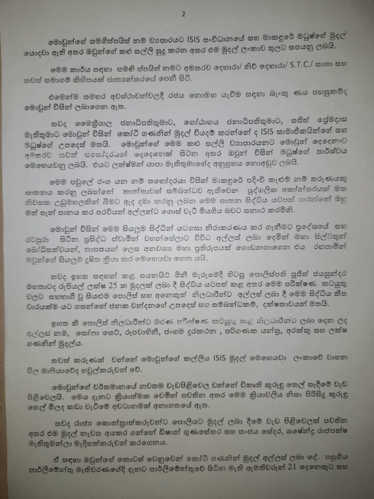 කළු සල්ලි ජාලය: ඔවුන්ගේ සමගි ස්පයිස් නම් ව්යාපාරයට ISIS සංවිධානයේ සහ මාකඳුරේ මධුෂ්ගේ මුදල් යොදවා ඇති අතර, එම මුදල් සුදු කර ලංකාව තුලට සපයනු ලබයි.