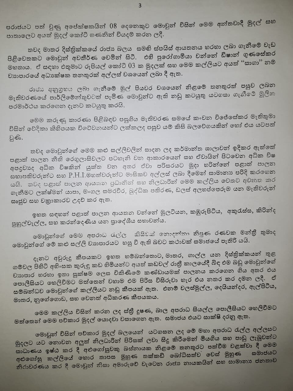 අමුණා ඇති ලේඛන මගින් ඉදිරිපත් කර ඇති බරපතල චෝදනා (විශේෂයෙන් ඝාතන සහ මුදල් විශුද්ධිකරණය) සහ ඒවා යටපත් කිරීමට දරන ලද උත්සාහයන් සලකා බලන විට, තිළිණ මධුසංඛ මහතා බස්නායක නිළමේ වැනි මහජන විශ්වාසය මත පදනම් වූ ගෞරවනීය තනතුරක් දැරීමට ඇති නෛතික සහ සදාචාරාත්මක යෝග්යතාවය පිළිබඳව දැඩි ප්රශ්න කිරීමක් සිදු කළ යුතුය. මෙම චෝදනාවල සත්යතාව තහවුරු කර ගැනීම සඳහා අදාළ රාජ්ය සහ නීතිය ක්රියාත්මක කරන ආයතන විසින් කඩිනම් සහ අපක්ෂපාතී විමර්ශන පැවැත්වීම අත්යවශ්ය වේ.මේ පිළිබඳව අප වෙත ලැබෙන තොරතුරු මෙන්ම මෙම බරපතල චෝදනාවලට එරෙහිව ගෙන එන තොරතුරු ද ඉදිරියේදී අපගේ වෙබ් අඩවියෙහි පළ කෙරෙනු ඇත.