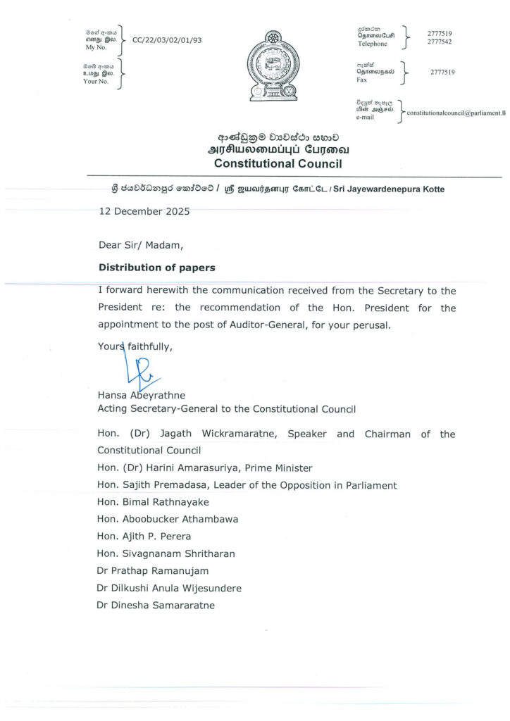 ආණ්ඩුක්‍රම ව්‍යවස්ථා සභාව විසින් මීට පෙර ඉදිරිපත් කළ නම් දෙකක් ප්‍රතික්ෂේප කිරීම සහ වැඩබලන විගණකාධිපතිවරයා පත් කිරීම පවා විෂමාචාර චෝදනා මත අනුමත නොකිරීම, එම සභාව දේශපාලන බලපෑම්වලින් තොරව කටයුතු කිරීමට දරන උත්සාහයක් පෙන්නුම් කරයි.