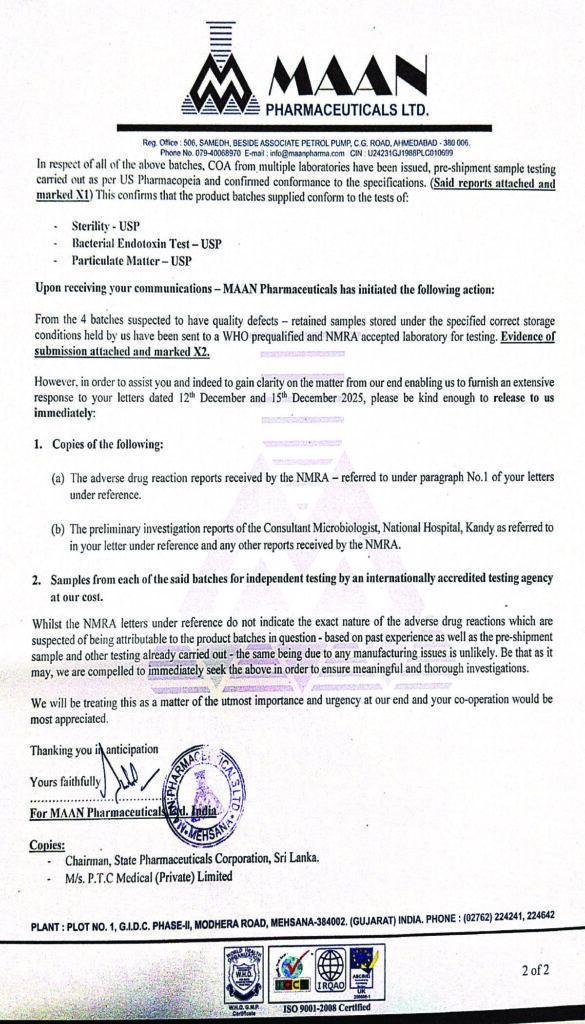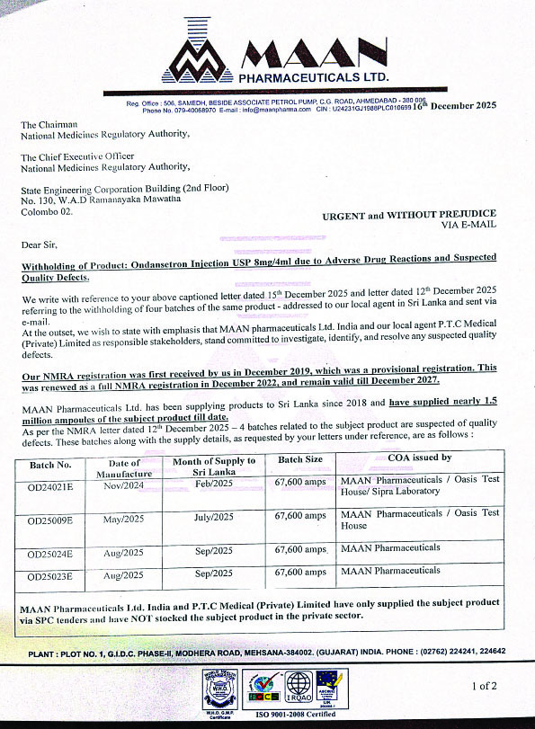 2025 දෙසැම්බර් 16 දිනැති ලිපියක් මගින් එම සමාගම අවධාරණය කරන්නේ තමන් සැපයූ ඖෂධ කාණ්ඩවල නිෂ්පාදන දෝෂයක් පැවතීමට ඇති ඉඩකඩ ඉතා අවම බවයි. (සම්පූර්ණ ලිපිය පහත අමුණු ඇත)