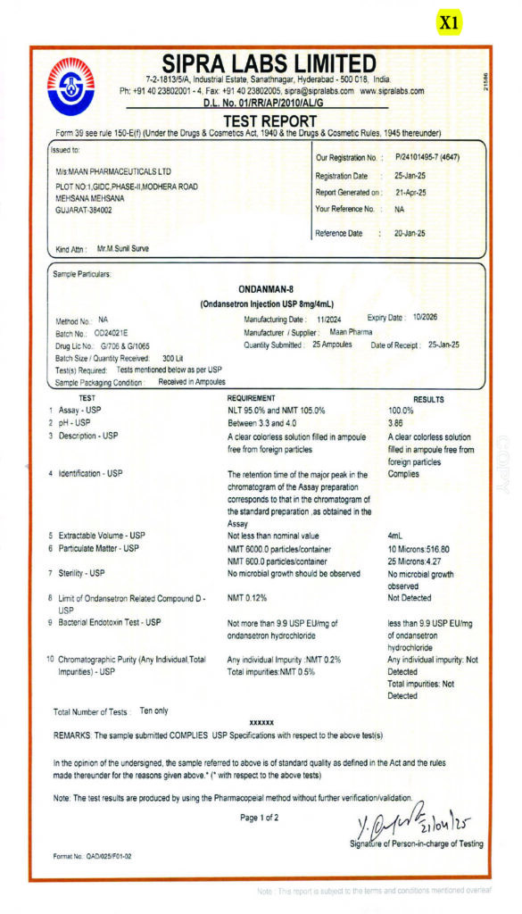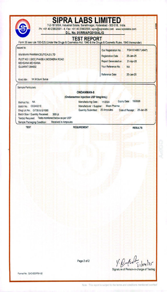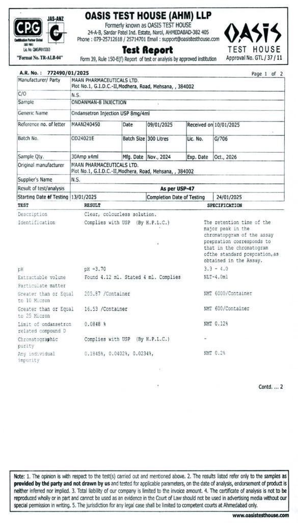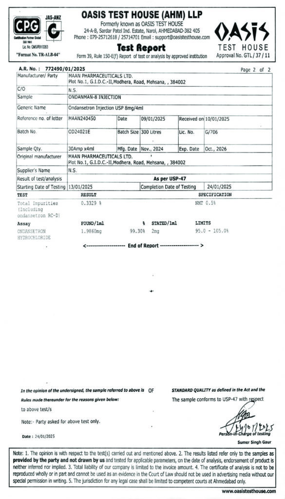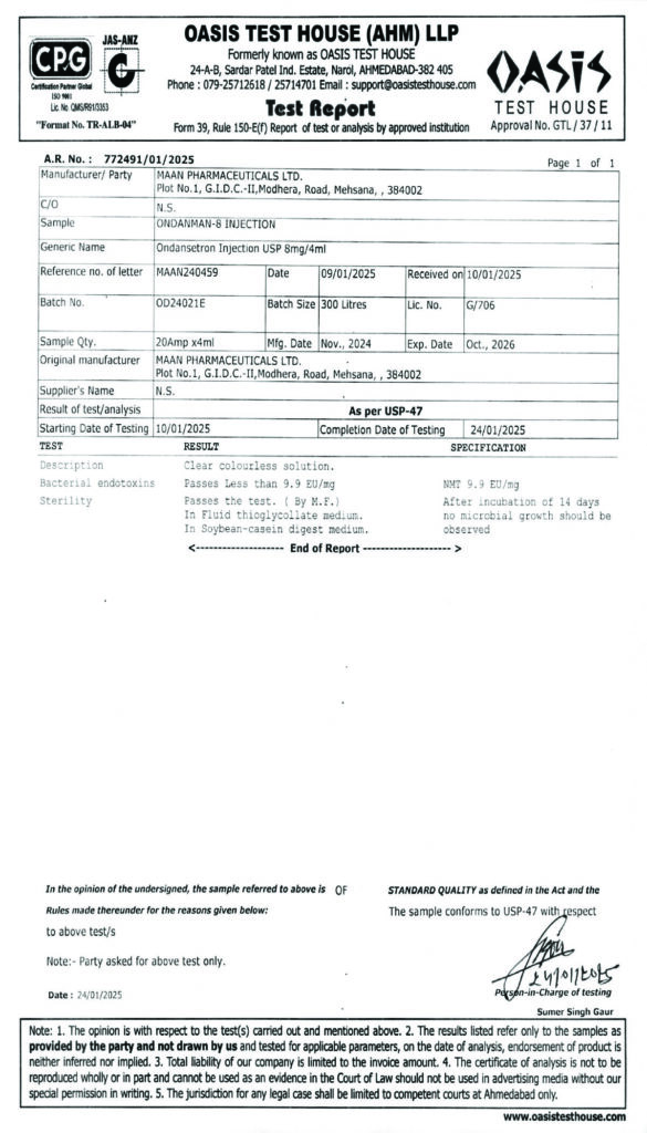මෙරට රජයේ රෝහල්වල භාවිත කළ Ondansetron (ඔන්ඩන්සෙට්රෝන්) එන්නත් කාණ්ඩ හතරක් භාවිතයෙන් ඉවත් කිරීමට ජාතික ඖෂධ නියාමන අධිකාරිය (NMRA) ගත් තීරණය සම්බන්ධයෙන් එම ඖෂධය නිෂ්පාදනය කරන ඉන්දියාවේ Maan Pharmaceuticals සමාගම සිය නිල ප්රතිචාරය දක්වා ඇත.
