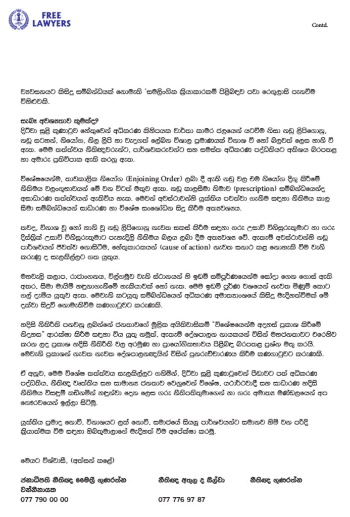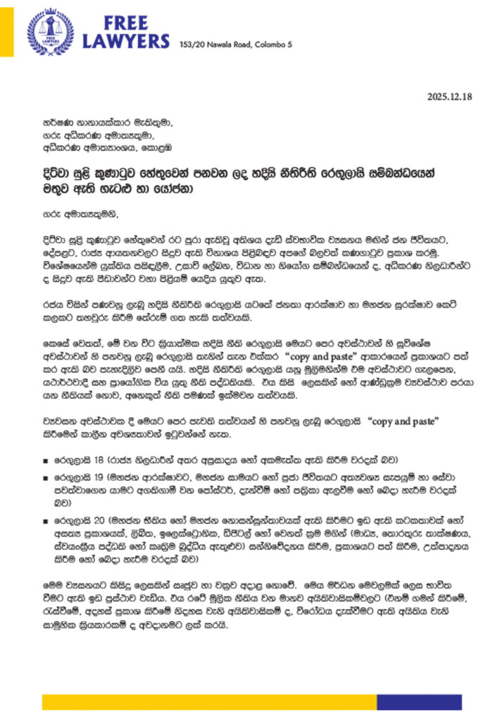 නිදහස් නීතීඥවරුන්ගේ සංගමය විසින් යොමුකර ඇති ලිපිය, ‘දිට්වා’ සුළි කුණාටුවෙන් පසු පනවන ලද හදිසි නීති රෙගුලාසිවල පවතින ප්රායෝගික නොවන ස්වභාවය සහ ඉන් අධිකරණ පද්ධතියට සිදුව ඇති බලපෑම පිළිබඳව අධිකරණ අමාත්ය හර්ෂණ නානායක්කාර මහතා වෙත යොමු කරන ලද විවෘත ඉල්ලීමකි.