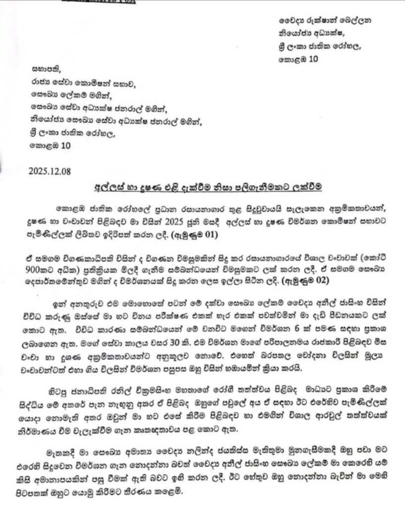වෛද්ය රුක්ෂාන් බෙල්ලන මහතා චෝදනා කරන්නේ මෙම මහා පරිමාණ දූෂණය පිළිබඳව තමා 2025 ජුනි මසදී අල්ලස් හෝ දූෂණ විමර්ශන කොමිෂන් සභාවට පැමිණිලි කිරීම නිසා, සෞඛ්ය අමාත්යාංශයේ ලේකම් වෛද්ය අනිල් ජාසිංහ මහතා විසින් තමාගෙන් පළිගන්නා බවයි.