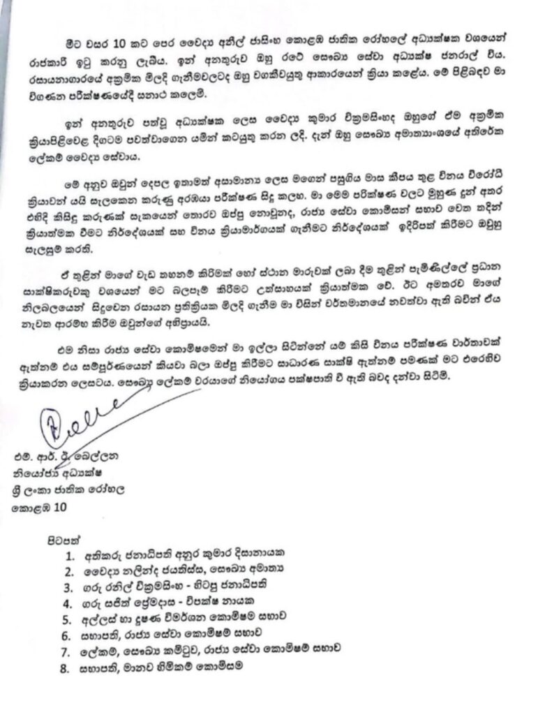 වෛද්ය බෙල්ලන මහතා පෙන්වා දෙන්නේ මීට වසර 10කට පෙර අනිල් ජාසිංහ මහතා ජාතික රෝහලේ අධ්යක්ෂවරයාව සිටි සමයේ පටන් මෙම ප්රතික්රියක මිලදී ගැනීමේ අක්රමිකතා සිදුව ඇති බවත්, එම තොරතුරු හෙළිදරව් වීම වැළැක්වීමට තමාට එරෙහිව පදනම් විරහිත විනය පරීක්ෂණ 06ක් පවත්වා අවසානයේ ඊයේ (18) දින සිට වැඩ තහනම් කිරීමට පියවර ගෙන ඇති බවත්ය.