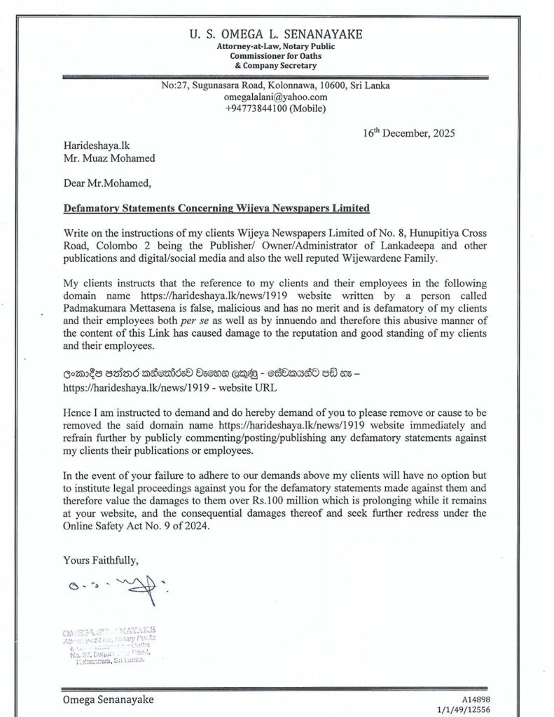 The legal consultant for Wijeya Newspapers Limited has issued a Letter of Demand regarding a news report published on the ‘Harideshaya’ (Harideshaya.lk) website concerning the company and its employees.