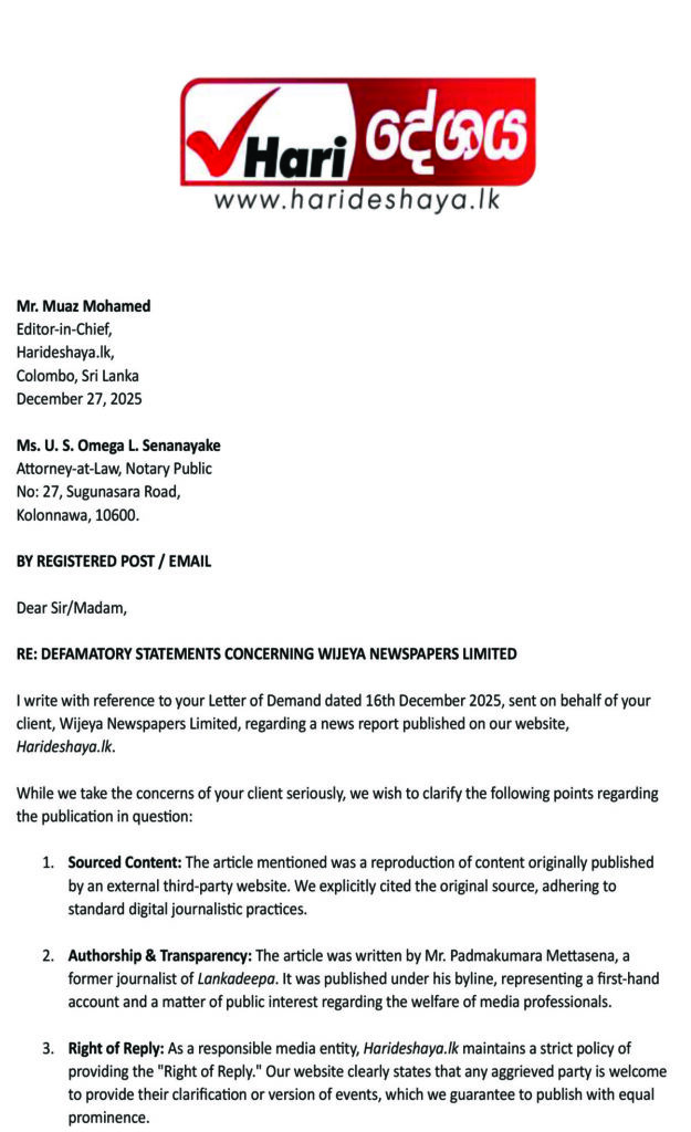 The management of ‘Harideshaya’ emphasizes that the news in question was published with its original sources cited. We believe that reporting on the professional challenges and grievances faced by journalists is a fundamental responsibility of a responsible media organization. Furthermore, if Wijeya Newspapers Limited wishes to provide a clarification regarding this report, we are prepared to grant them space at any time under the ‘Right of Reply.’