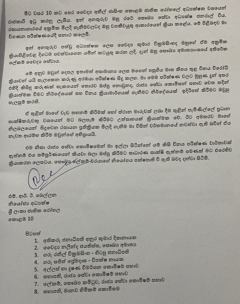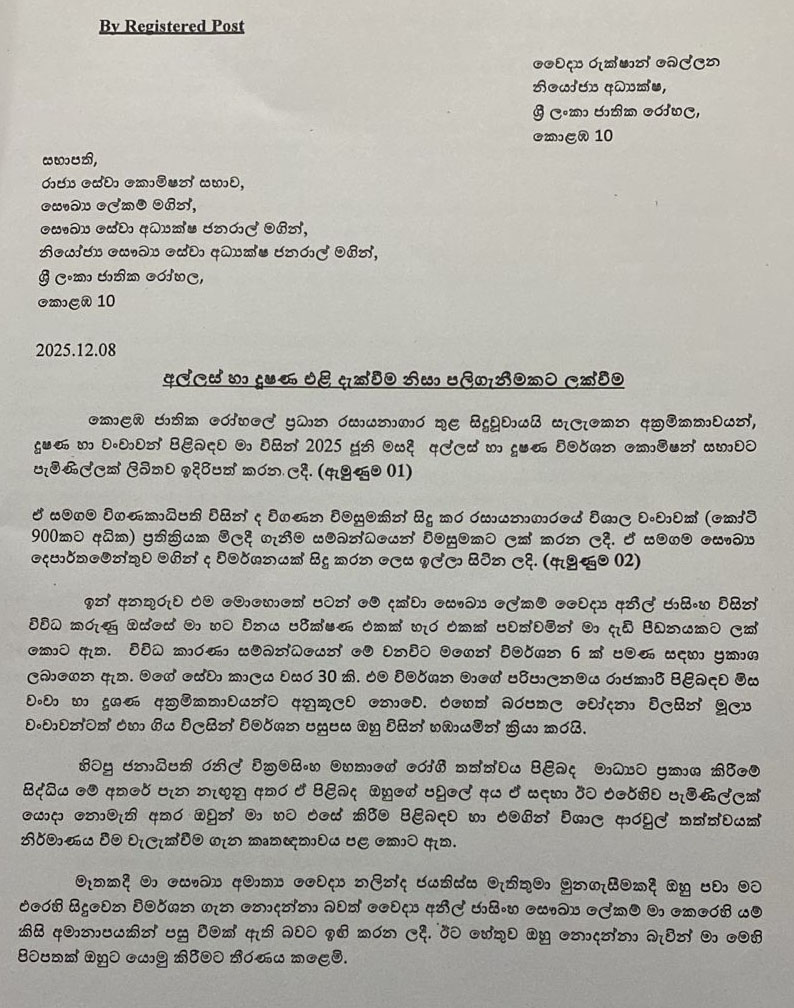 කොළඹ ජාතික රෝහලේ නියෝජ්ය අධ්යක්ෂවරයාව සිටි වෛද්ය රුක්ෂාන් බෙල්ලන මහතා විසින් අල්ලස් හෝ දූෂණ විමර්ශන කොමිෂන් සභාව වෙත ඉදිරිපත් කළ ලිපිය මගින් (2025.12.08 දිනැති) බරපතල කරුණු රැසක් අනාවරණය කර ඇත.
