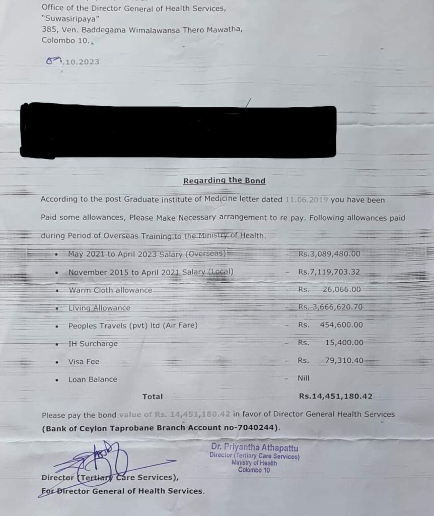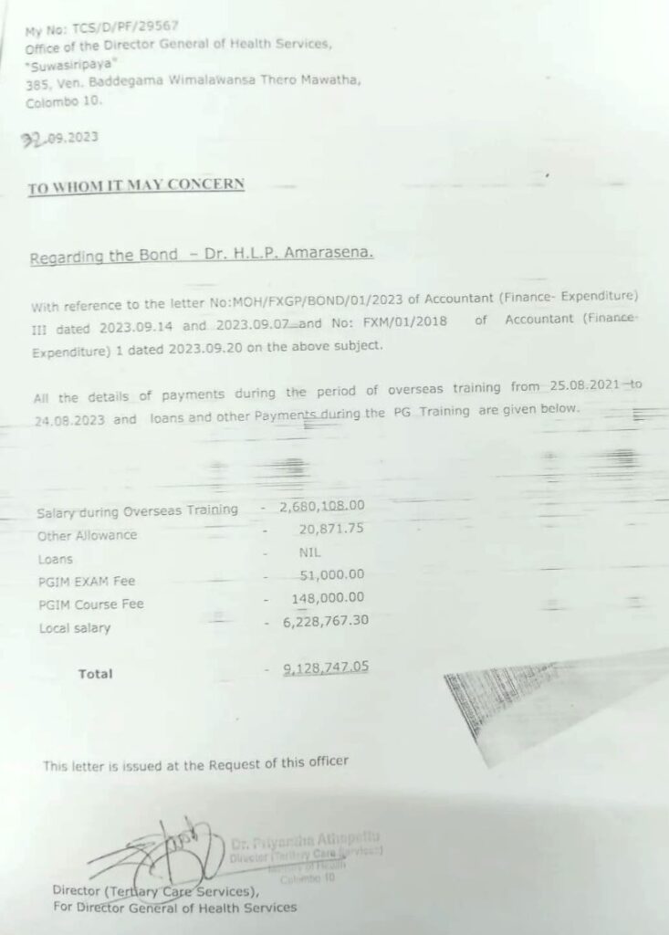 සෞඛ්ය අමාත්යාංශයේ ජ්යෙෂ්ඨ නිලධාරියෙක් මෙය ‘වැටුප‘ නොව PGIM පුහුණුව සඳහා වූ වියදමට සමාන දඩ මුදලක් බව පවසන අතර, එය මෑතකදී හඳුන්වා දුන් ක්රමවේදයක් බවද සඳහන් කර ඇත. විශේෂඥ වෛද්යවරුන් පවසන්නේ පුහුණු කාලය තුළ උපයාගත් වැටුප ආපසු ගෙවිය යුතු බවට බැඳුම්කර ගිවිසුමේ කොතැනකවත් සඳහන් නොවන බවයි. මෙම මතභේදාත්මක හා අනපේක්ෂිත ඉල්ලීම වෛද්ය ප්රජාව අතර දැඩි කනස්සල්ලක් ඇති කර තිබේ.