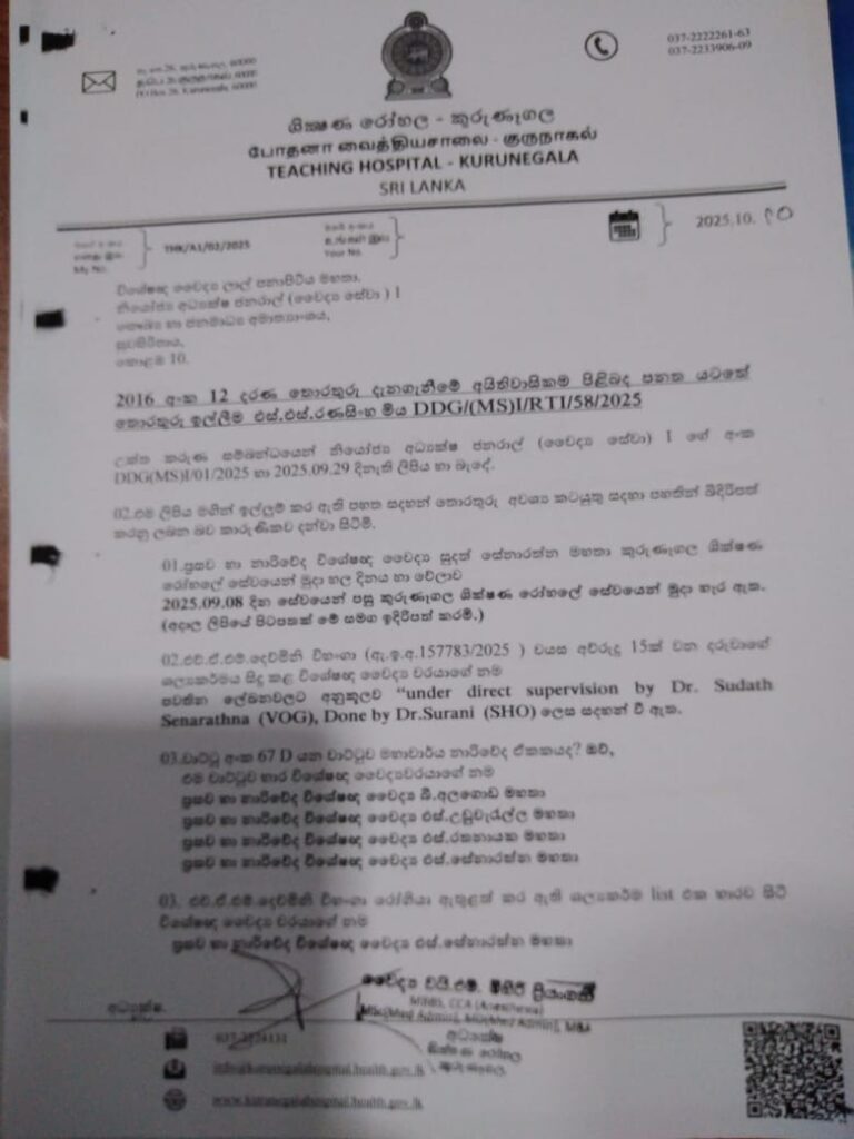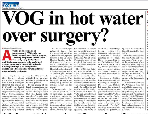 කුරුණෑගල රෝහලෙන් නිදහස් වී, ද සොයිසා රෝහලේ රාජකාරි භාරගත් නාරි හා ප්රසව විශේෂඥ වෛද්යවරයකු (VOG) ඊට දින දෙකකට පසු (තවදුරටත් කුරුණෑගලට අනුයුක්තව නොසිටියදී) එහිදී ප්රධාන සැත්කමක් සිදු කිරීමේ සිද්ධිය මේ සඳහා ප්රබල උදාහරණයකි.