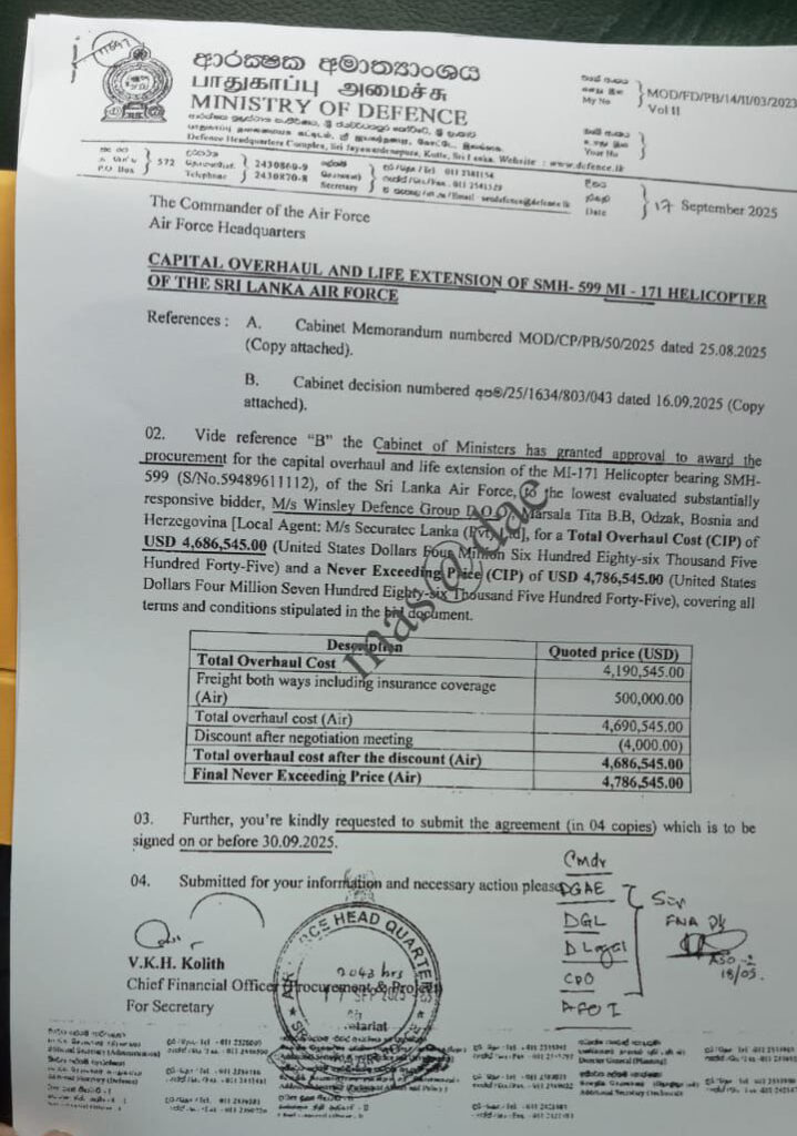 ශ්‍රී ලංකා ගුවන් හමුදාවට අයත් MI – 17 වර්ගයේ හෙලිකොප්ටර් යානා 4ක් (SMH 599, SMH 596, SMH 588, SMH 4416) අලුත්වැඩියා කිරීම සඳහා වන ටෙන්ඩරය පිරිනැමීම මේ වන විට බරපතලම චෝදනාවලට ලක්ව ඇති රාජ්‍ය ප්‍රසම්පාදන ක්‍රියාවලියක් බවට පත්ව ඇත. චෝදනාවල ප්‍රධාන ස්වභාවය වන්නේ, ටෙන්ඩරයේ අත්‍යවශ්‍ය තාක්ෂණික හා නියාමන කොන්දේසි සම්පූර්ණ නොකළ සමාගමකට කොන්ත්‍රාත්තුව ලබා දී තිබීමයි. ඊටත් වඩා බරපතල ලෙස, මෙම තීරණය පිටුපස කොළඹ ඇමරිකානු තානාපති කාර්යාලයෙන් එල්ල වූ බලපෑමක් පවතින බවට දේශපාලන ආරංචිමාර්ග සහ දේශීය මාධ්‍ය සෘජුවම වාර්තා කරයි. මෙම සිදුවීම වත්මන් රජය සම්බන්ධයෙන් එල්ල වන ඩිමෝ බස්, හාල් සහ ගල් අඟුරු ටෙන්ඩර් අසාර්ථකවීම් මාලාවේම කොටසක් වන අතර, මෙහිදී විශේෂ අවධානය යොමු වන්නේ විදේශීය රාජ්‍ය මැදිහත්වීම සහ ජාතික ආරක්ෂාවට ඇති විය හැකි අවදානම කෙරෙහිය.
