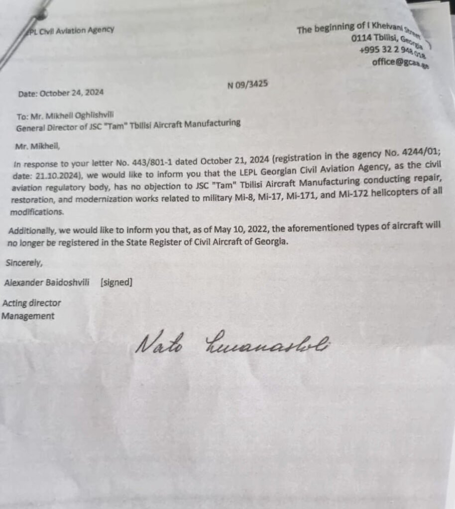 • විදේශීය ගුවන් සේවා ලේඛනය: ජෝර්ජියා සිවිල් ගුවන් සේවා ඒජන්සියේ ලිපිය (JSC “Tam” Tbilisi Aircraft Manufacturing වෙත)