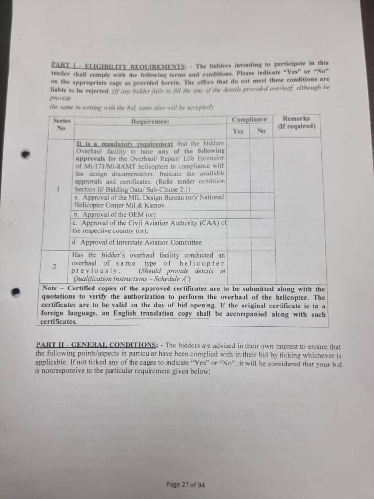 • ටෙන්ඩර් ලේඛන සහ අභ්‍යන්තර ලිපි: Mi-171SH හෙලිකොප්ටර් 4 සඳහා වූ ආරක්‍ෂක අමාත්‍යාංශයේ අභ්‍යන්තර ලිපි, ටෙන්ඩර් සුදුසුකම් අවශ්‍යතා ලේඛනය (PART I – ELIGIBILITY REQUIREMENTS)